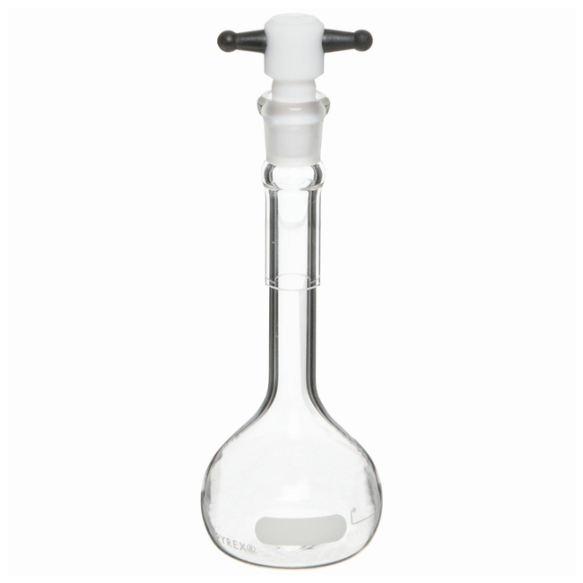 The strength of the flasks have been significantly increased through machine-blown bodies, which are sealed to heavy-tubing necks. The graduation line is sharp and permanent; large white block letters make the inscription easy to read. Supplied with PTFE color-coded, keyhole stoppers.