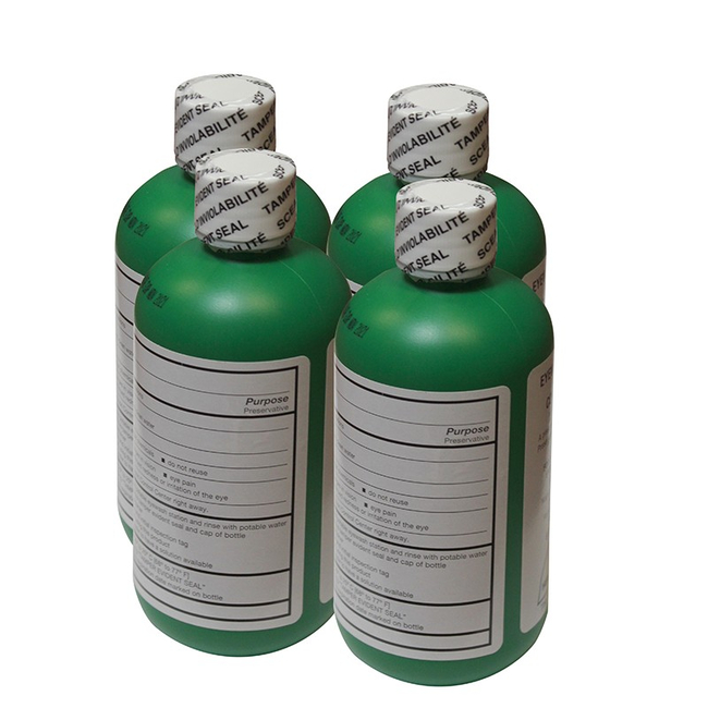 Model 9082, 'sterile' bacteriostatic preservative for use in portable eyewash stations. One 5 oz. (148 ml) bottle will preserve 5 to 20 gallons (18.9 to 75.7 L) of potable water for up to three months. Four bottles per carton.