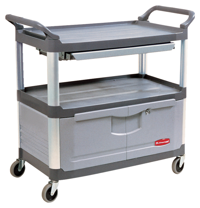 IncludesLockable doors, enclosed end panels on 3 sides, 3 easy-to-clean shelves with rounded interior corners and raised edges, ergonomically handles, quiet-rolling nonmarking 4 in. dia. casters