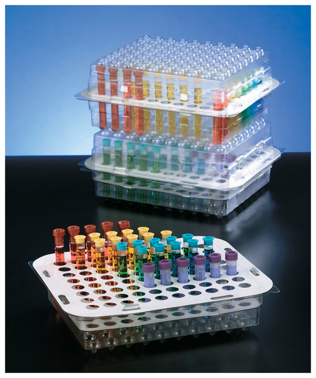 Designed with the lab professional in mind, the Test 'n Toss is perfect for clinical labs, hospitals, research labs, reference labs, EMS, physician offices and alternate care sites. It holds up to eighty 16 x 100mm tubes in a leak-resistant plastic shell to contain spills. As an option, use a second shell as a cover, completely enclosing contents for transport or storage and allowing racks to be stacked. Uniquely designed divider shelves can be used singly or in pairs for extra tube stability.